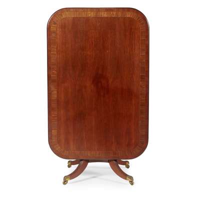 the rounded rectangular tilt top with crossbandings, on a moulded square column support with diamond inlay and a quadripartite base raised on reeded scroll legs ending in palmette cast brass caps and castors