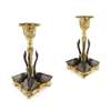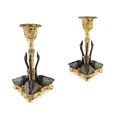 PAIR OF GILT AND PATINATED BRONZE SWAN CANDLESTICKS, DESIGNED BY WILLIAM BATEMAN II FOR RUNDELL, BRIDGE AND RUNDELL