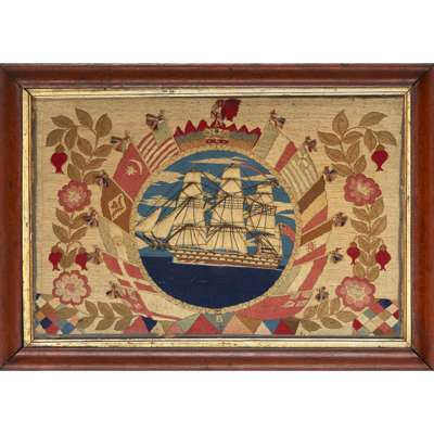 of rectangular form, stitched with a central circular portrait of HMS Cornwallis enclosed by twelve allied flags with tufted wool flagpole finials, within a border of poppies, in a glazed frame