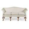 the hump back above a three-cushion seat and outscrolled arms, raised on eight scroll-carved cabriole legs ending in pad feet, covered in ecru fabric outlined in contrast piping