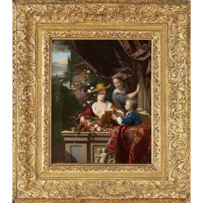 ELEGANT FIGURES ON A TERRACE WITH BOWL OF ASSORTED FRUIT
