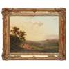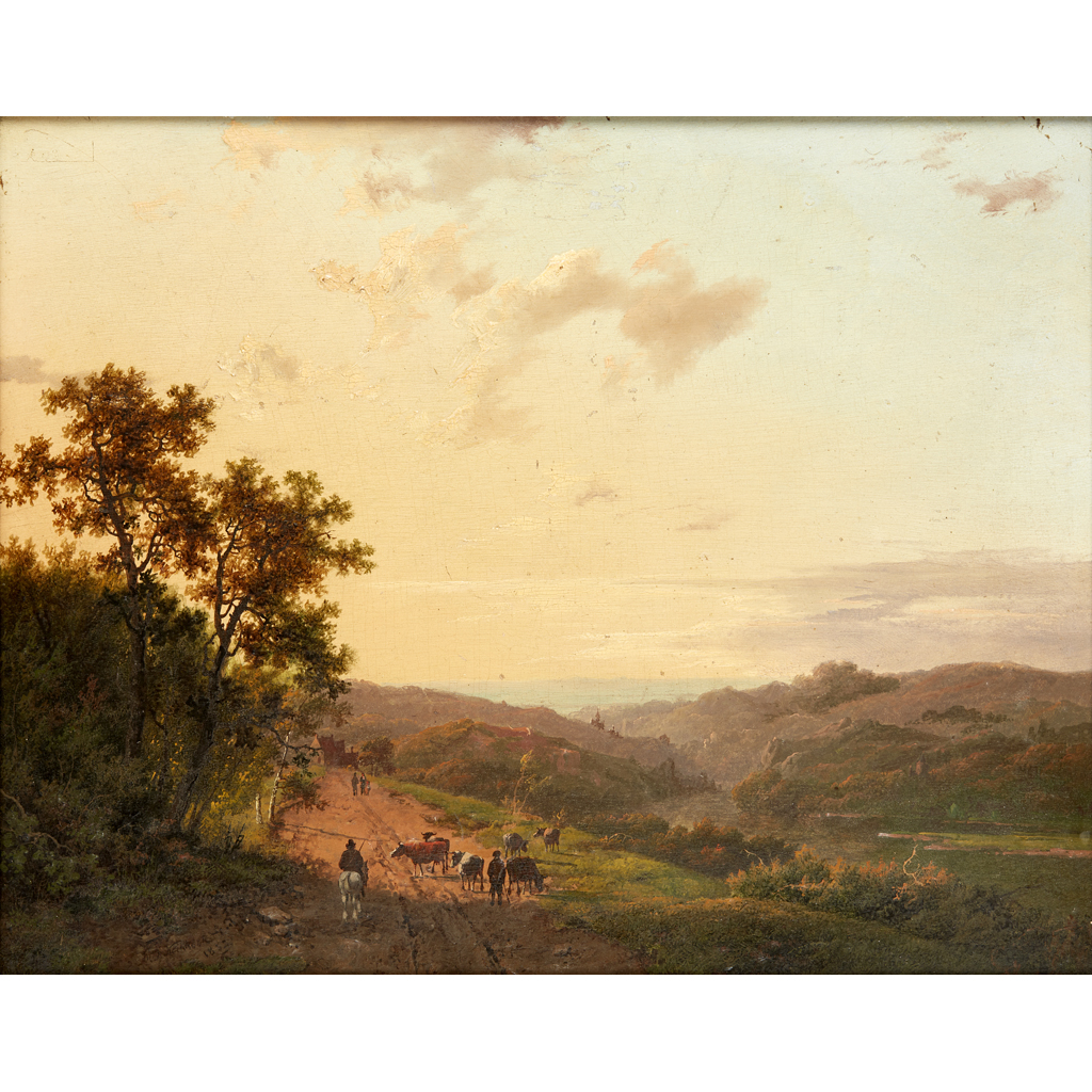 SHEPHERDS AND THEIR CATTLE ON A COUNTRY LANE, WITH DISTANT LANDSCAPE