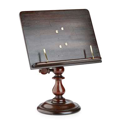 the adjustable bookrest with brass clips, on a turned column support and circular base