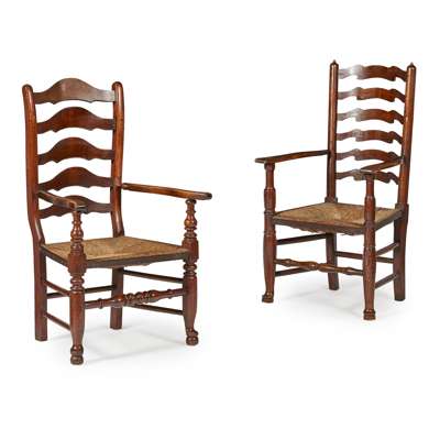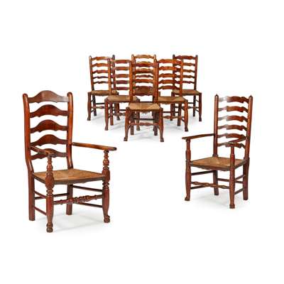 comprising six side chairs and two armchairs, with shaped ladder backs above rush seats on turned legs joined by stretchers (8)