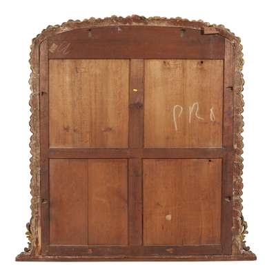 the arched mirror plate in a rocaille frame with acanthus scroll brackets to the base