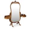 the shaped rectangular mirror plate with scroll and flower cresting, with a curved mid-tier with a pierced gallery and short drawers, raised on curved supports and flower carved trestle bases with scroll toes and ceramic castors