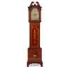 the swan neck pediment above an arched brass dial with a silvered Arabic numeral chapter and subsidiary Chime/Silent dial, above an arched trunk door with urn inlay, on a plinth base with a fan medallion inlay and raised on bracket feet; the eight day movement with a gong strike and playing on five chimes