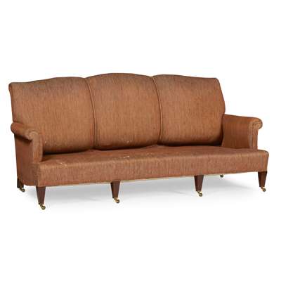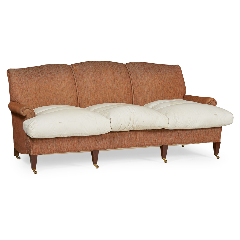 the triple arched back above a loose cushion seat and low scroll arms, raised on square tapered legs ending in brass castors, in distressed terracotta upholstery, the seat cushions without covers