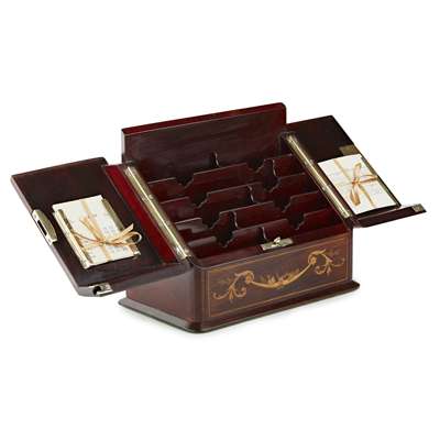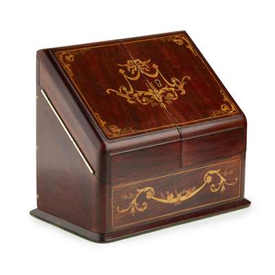 EDWARDIAN ROSEWOOD, MAHOGANY, MARQUETRY AND PENWORK STATIONERY BOX Y
