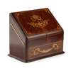 the hinged and divided slant front decorated with ribbon tied swags and scrolls, opening to a compartmented interior and calendar date/year card inserts