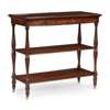 the rectangular top with a cockbeaded edge above a long frieze drawer, over two conforming tiers raised and divided by turned baluster supports, on ceramic castors