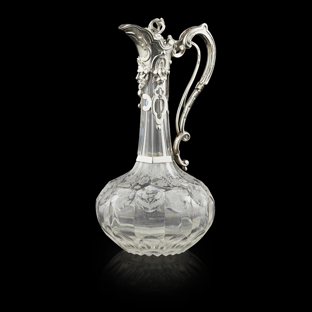 the scrolled handle with lever operating the hinged cover, above a pierced collar flanking a mask, fitted to a panelled neck terminating in a facet-cut bulbous body wheel-engraved with thistles, roses and fruiting vines, with Victorian design lozenge for 21 August, 1851