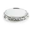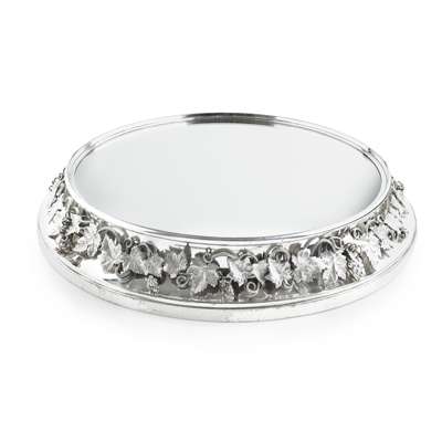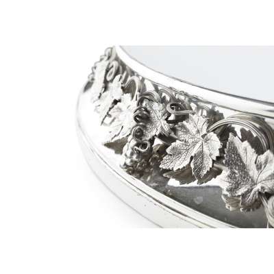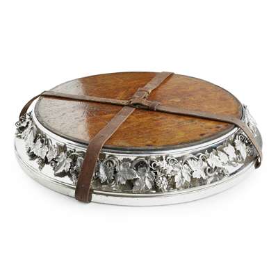 the circular mirror plate in a cavetto moulded silver-plate frame with applied grapevines and grape clusters; complete with an oak and baize lined panel insert and leather securing straps