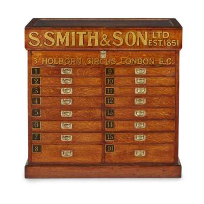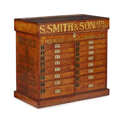 the hinged glazed vitrine top above an arrangement of numbered graduated drawers with recessed brass handles, on a plinth base; the front marked in gilt letters S.SMITH & SON LTD EST 1851/ 3 HOLBORN CIRCUS LONDON E.C.; the sides further lettered in gilt SECOND HAND WATCHES BOUGHT & SOLD and WATCHES & CLOCKS REPAIRED & SERVICED