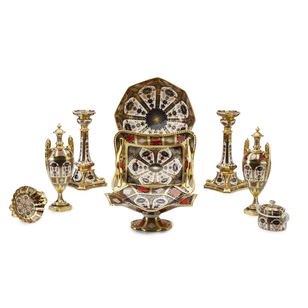 in the Imari palette, pattern no. 1128, comprising a punch bowl, 29cm diam.; a pair of candlesticks, 26.5cm high; a pair of urns, 30cm high; a footed comport, 30cm diam.; a footed serving dish with twin-handles, 28.5cm wide; a small dish, 16cm wide; and a covered sugar bowl, 15cm wide, printed marks (9)