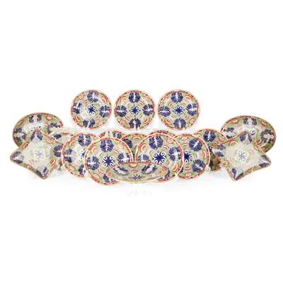 transfer-printed and painted in polychrome enamels, depicting flowers and foliage, impressed maker's marks and date codes, printed marks, and painted pattern marks G4210, comprising a footed tazza, 23.5cm diam.; two oval dishes, 25.5cm wide; two diamond-shaped dishes, 26.5cm wide; and 12 plates, 20.5cm diam. (17)