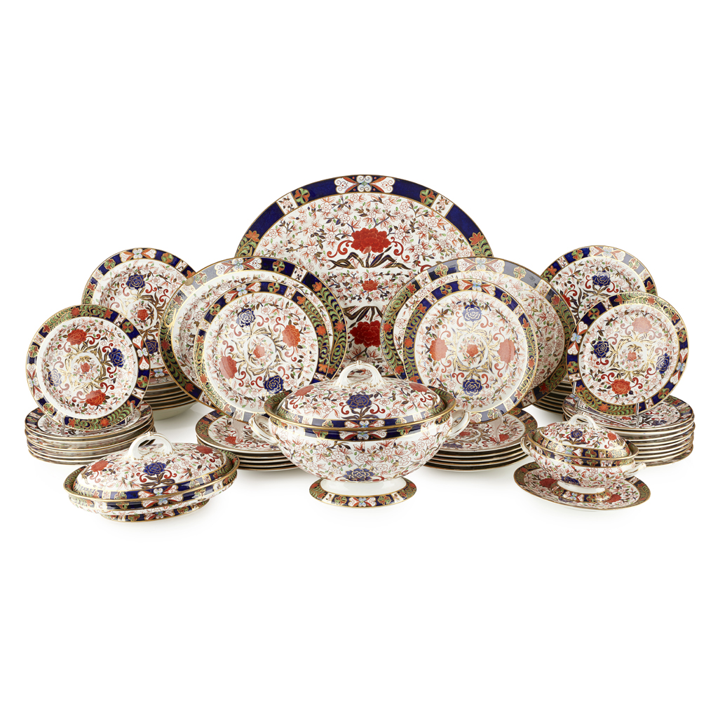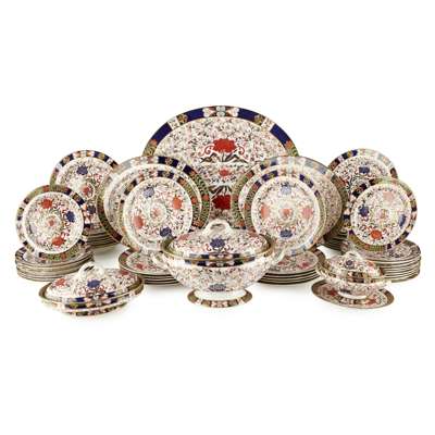 in the Imari palette with gilt highlights, impressed and printed maker's marks, painted pattern no. 495, comprising a covered soup tureen, 24cm high, and underplate, 41.5cm wide; a covered sauce tureen, 14.5cm high, and underplate, 23cm wide; a covered vegetable tureen, 14cm high; a meat platter, 55cm wide; an oval platter, 39cm wide; eight soup plates; 22 dinner plates; 10 lunch plates; and eight dessert plates (qty)
