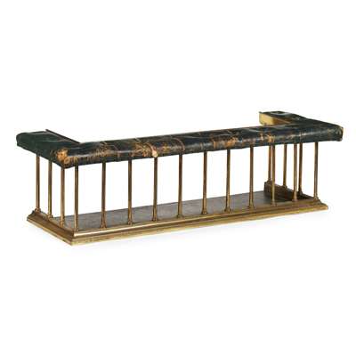 the green leather button upholstered top raised on plain brass rails on a moulded base
