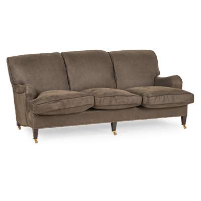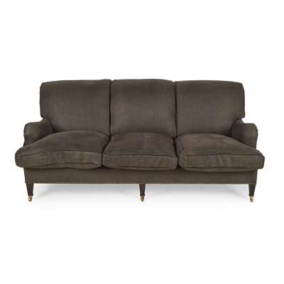the three-section fixed cushion back above a three cushion seat and low scroll arms, in grey upholstery with nail head trim, raised on square tapered legs with brass caps and castors