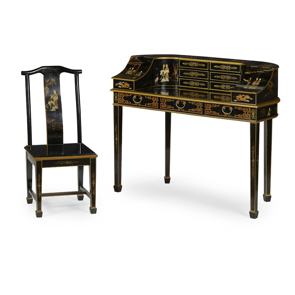 the superstructure with an arrangement of short drawers, cupboard doors and sloped compartments, above three short frieze drawers, raised on square tapered legs with spade feet, decorated throughout with Chinese figures, pavilions, and dragons; the chair similarly decorated (2)