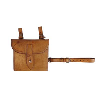 comprising a rectangular glass flask with a hinged silver cap and a silver sandwich box with silver gilt interior and ring handle, in a brown leather case with straps