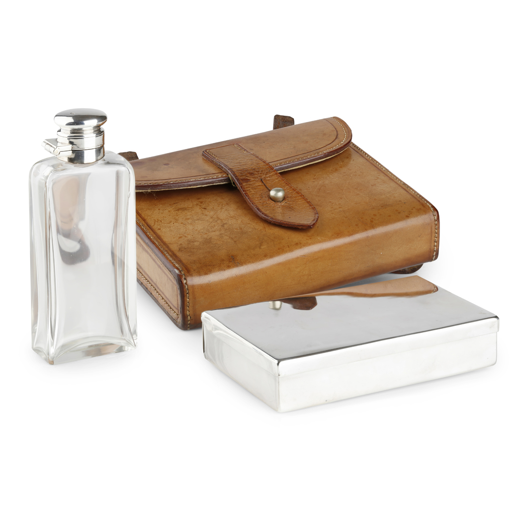 LEATHER CASED SILVER SANDWICH BOX AND FLASK SET