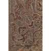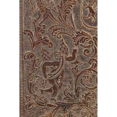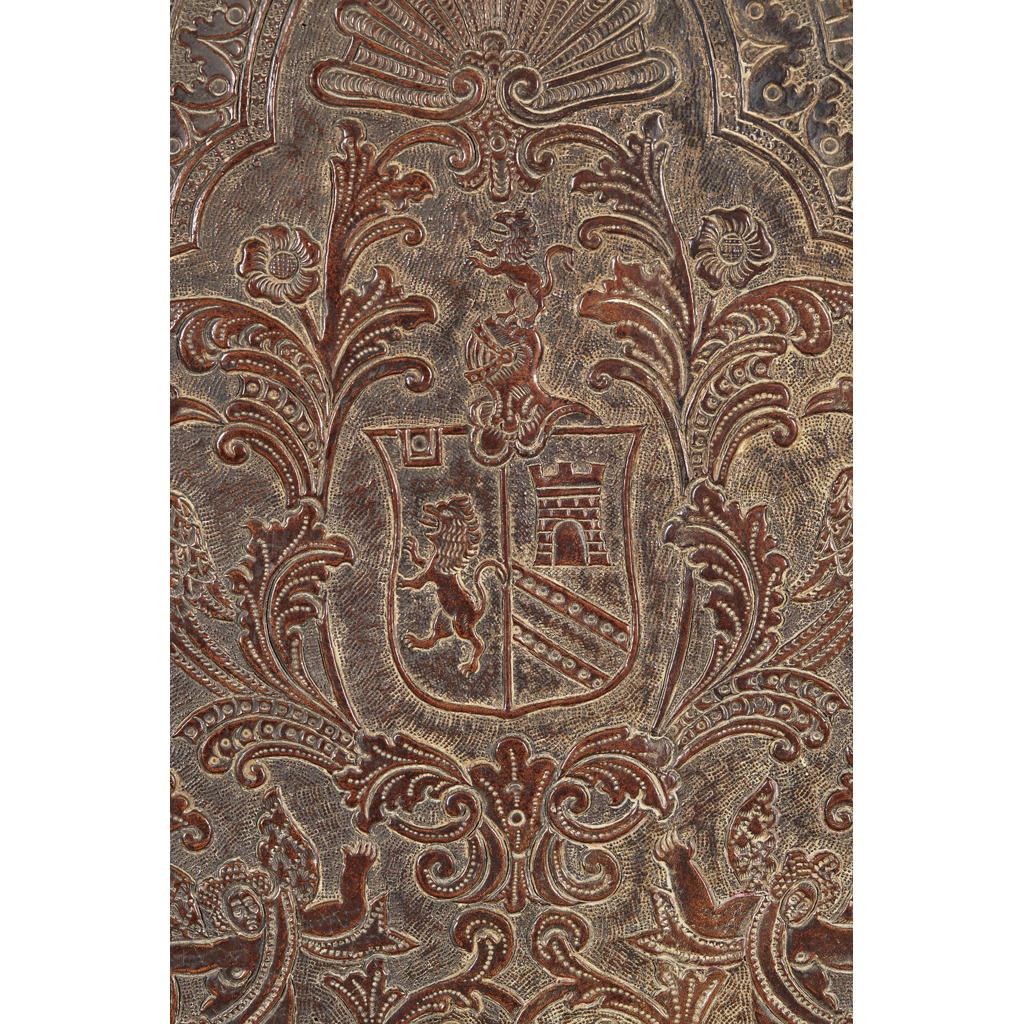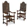 in 17th century style, the high arched backs and square seats covered in embossed leather with a heraldic shield, figures, birds, shell and foliate motifs outlined with brass bosses, flanked by acanthus carved scroll arms, raised on baluster and block turned legs joined by interlaced S scroll stretchers (2)