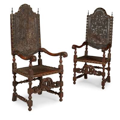 PAIR OF FLEMISH WALNUT AND TOOLED LEATHER ARMCHAIRS
