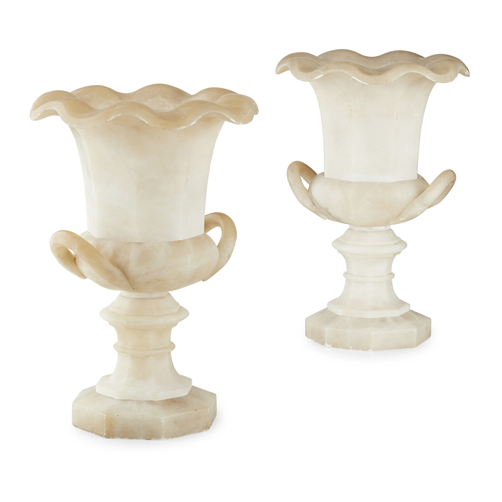 of campana form with wavy rims and panelled bodies with twin handles, on socles with octagonal bases, drilled (2)