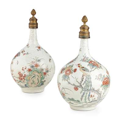 of bottle form, decorated with exotic birds, insects and flowers, the necks mounted with gilt bronze collars and covers with berry finials, unmarked (2)