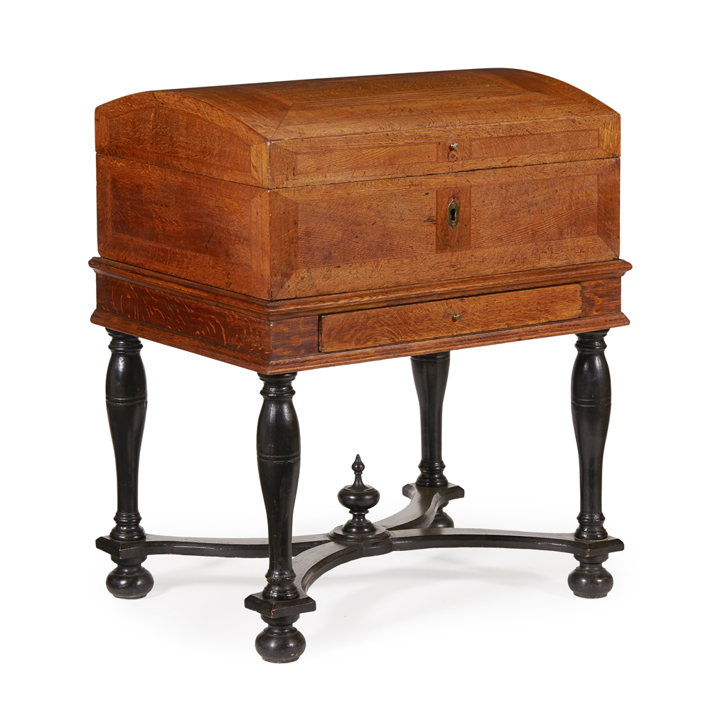 the domed top with geometric parquetry centred by a star motif, opening to a void interior, on an oak base with frieze drawer raised on ebonised baluster legs joined by curved X stretchers with an urn finial and ending on bun feet