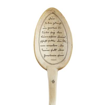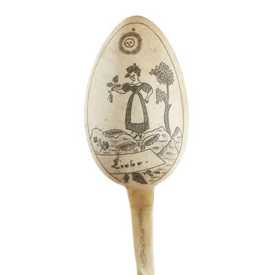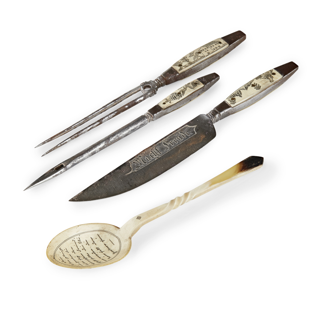 the handles with engraved horn plaques, with script verso, the knife marked DIE SCHNEIDE/ MACHT FREÚDE, all contained in a leather pouch, knife 22cm long; together with a CARVED HORN SPOON, with similar decoration, the back depicting a lady and inscribed LIEBE, 19cm long (2)