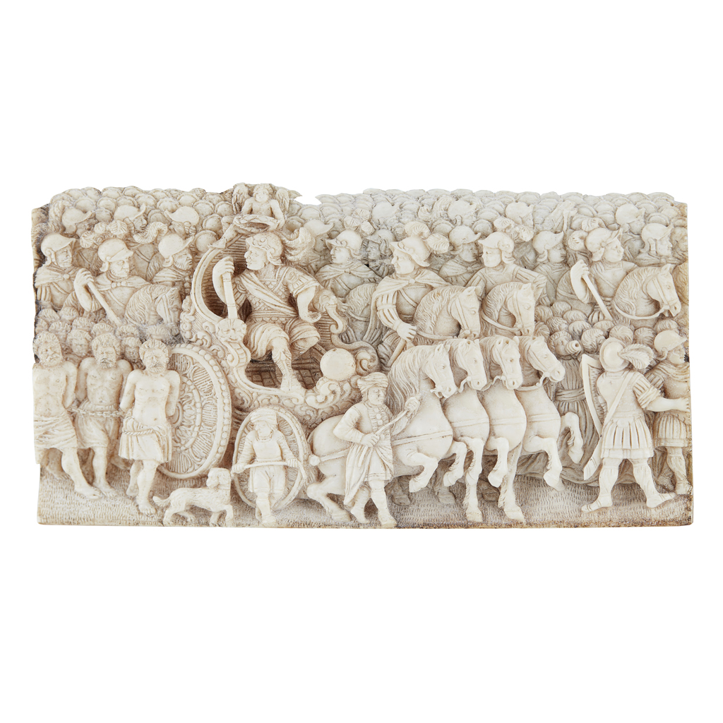 depicting a Roman triumph procession with Emperor Marcus Aurelius in a chariot drawn by four horses, attended by soldiers, and a group of chained prisoners