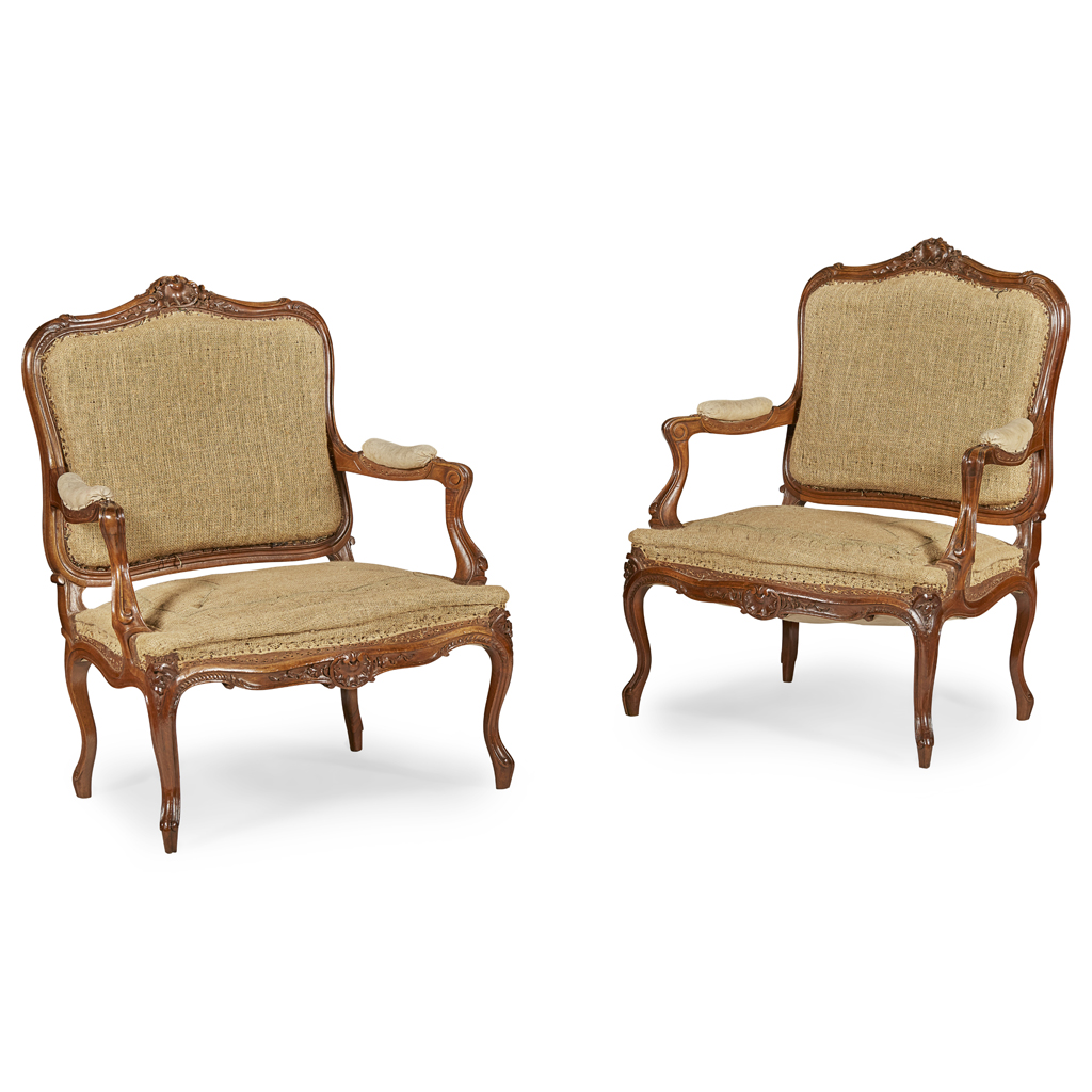 PAIR OF FRENCH CARVED WALNUT ARMCHAIRS