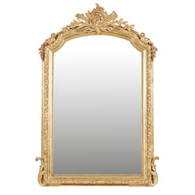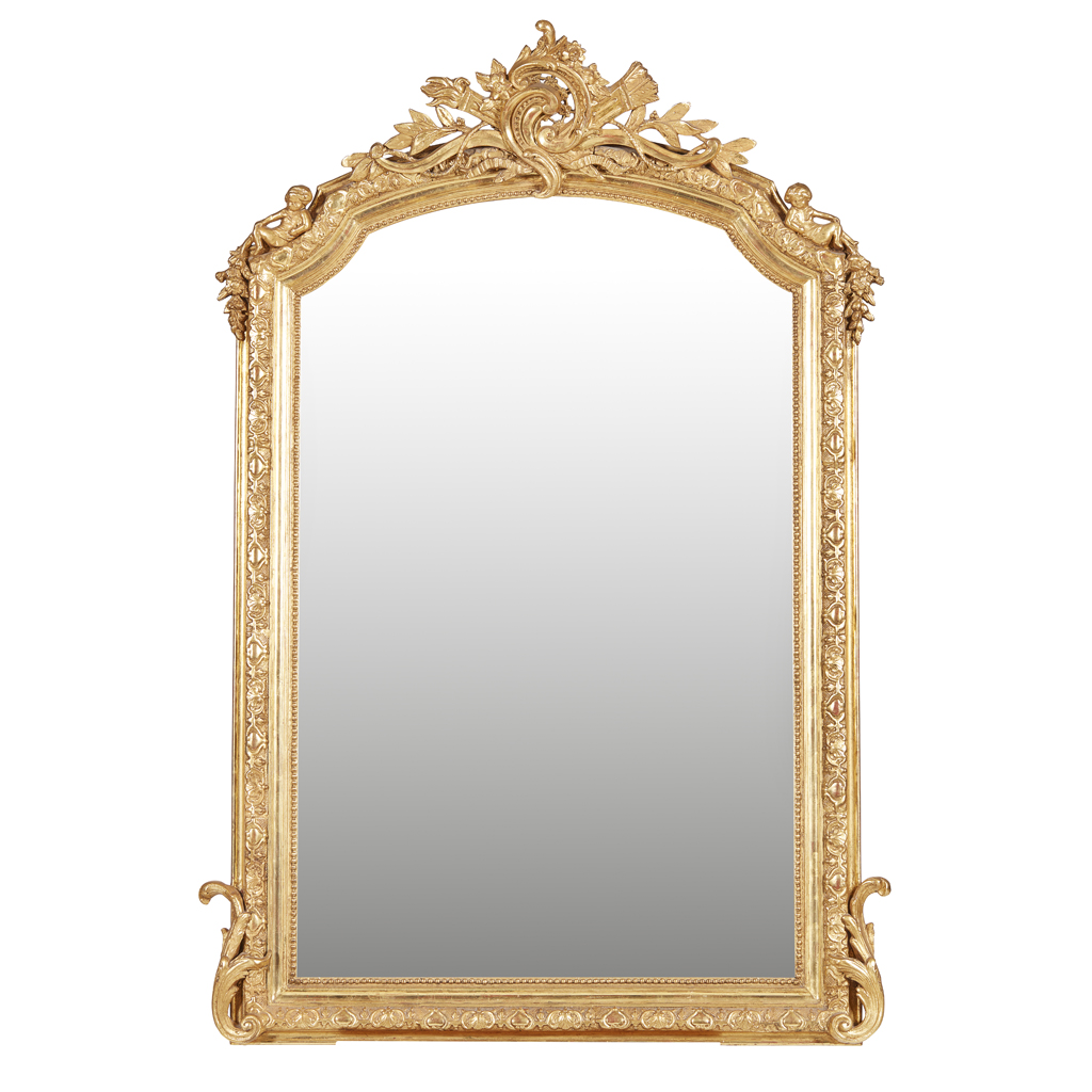 in the Louis XIV style, the arched mirror plate in a beaded slip and shell and leaf moulded frame with C scroll and trophy cresting, with recumbent putti to the corners