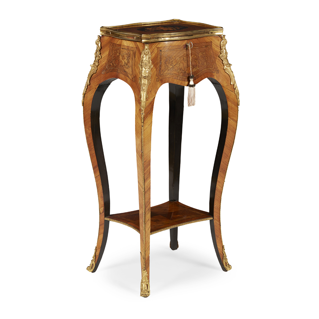 FRENCH KINGWOOD, MARQUETRY AND BRASS BANDED TEA POY