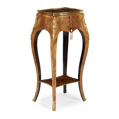 in the Louis XV style, the hinged top with floral marquetry opening to a twin compartment interior, raised on squared cabriole legs joined by an undertier and ending in sabots