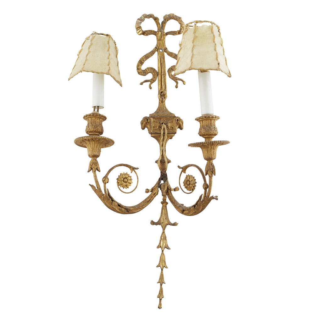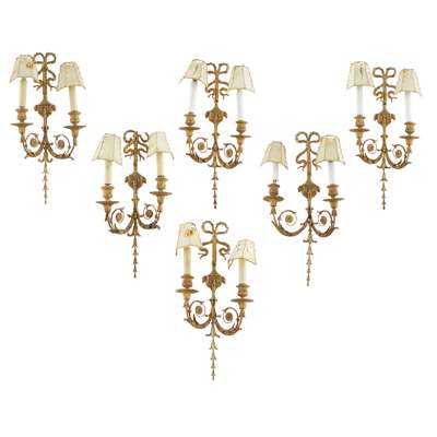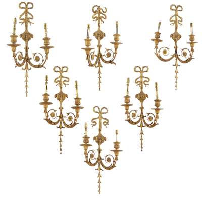 the ribbon-tied backs with rams' heads and bellflower trails, and issuing pairs of leafy up-scrolled candle branches with urn sconces, electrified (6)