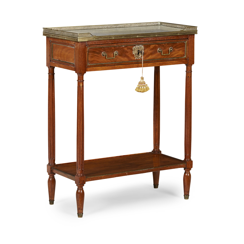 FRENCH DIRECTOIRE MAHOGANY, BRASS AND MARBLE WORK TABLE