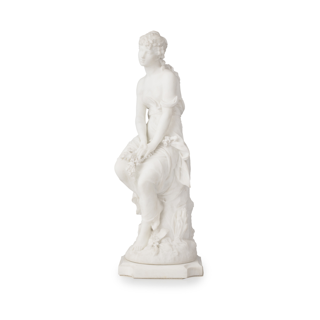white marble, depicting a seated semi-nude young woman, signed HIP. MOREAU/ 8È FAISE/ DE SCULPTURE/ L'ART /18, on a pivotting shaped square base