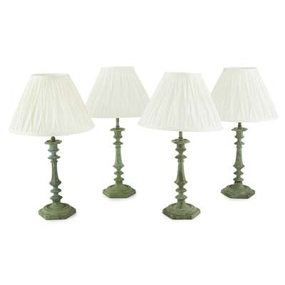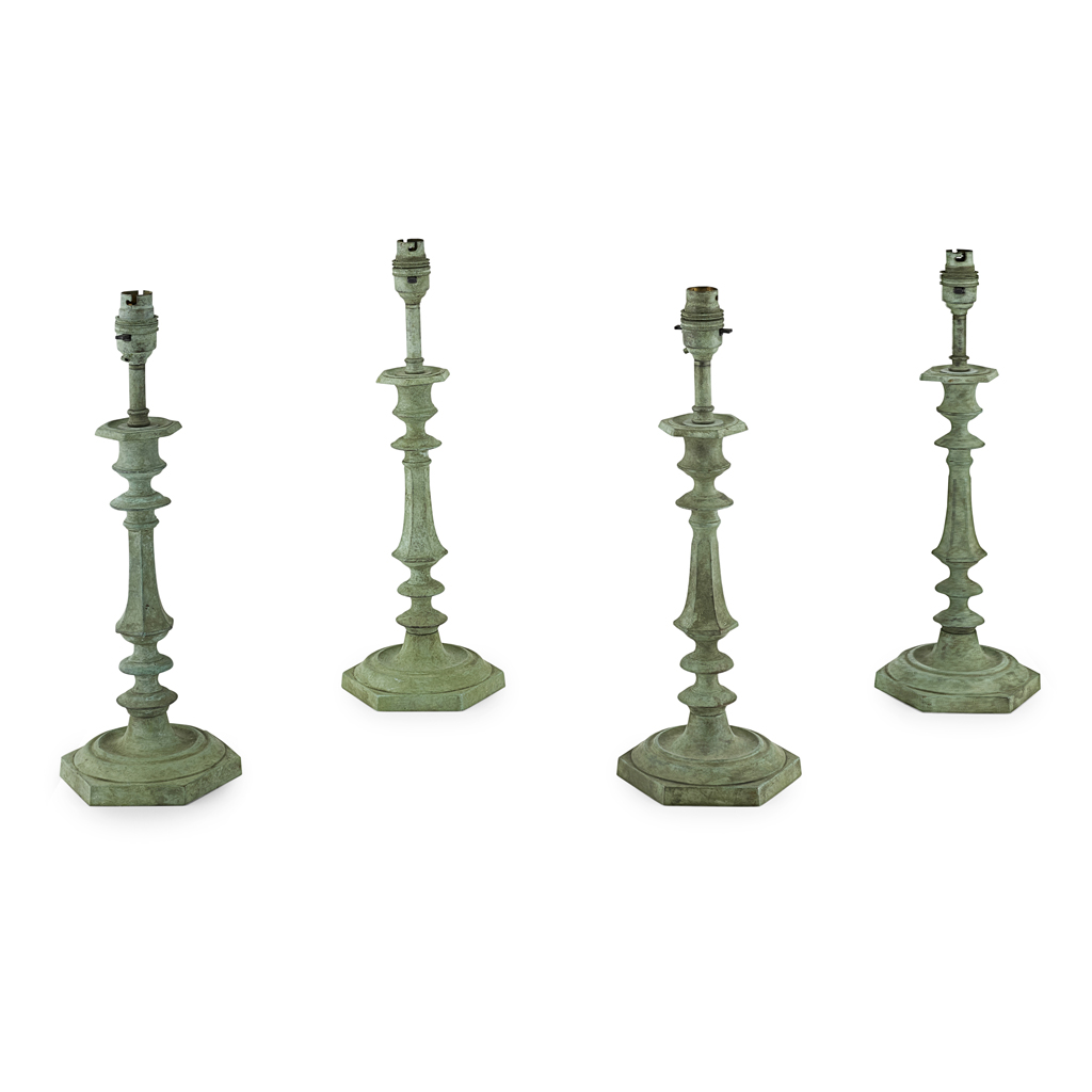 FOUR VERDIGRIS PATINATED BRONZE TABLE LAMPS