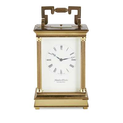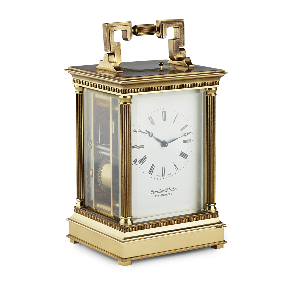 the four bevelled glass case enclosing a white enamelled dial, with retailer's mark 'Hamilton& Inches, Edinburgh' and inscribed SWISS MADE, the back plate with separate inscription, striking a gong