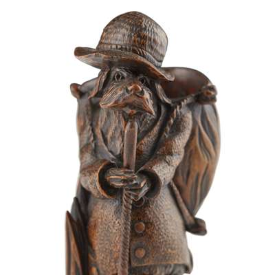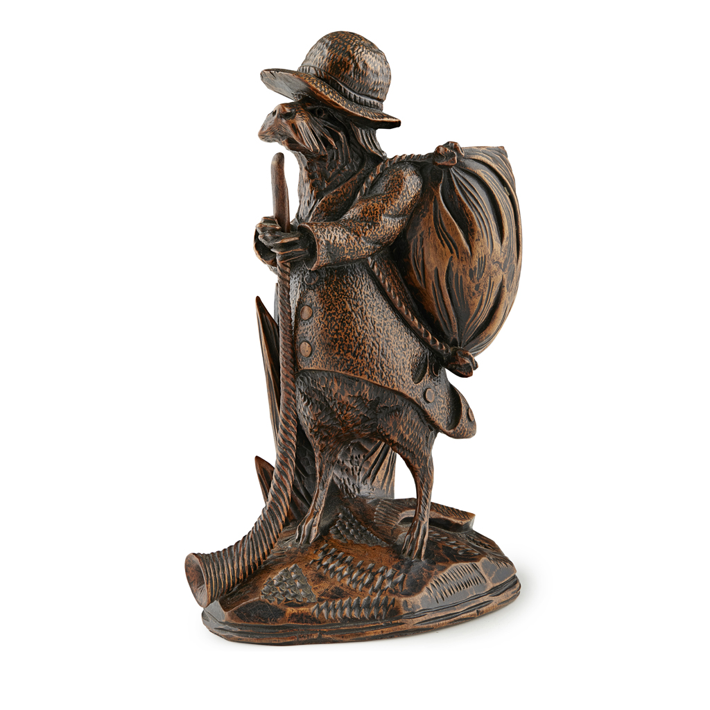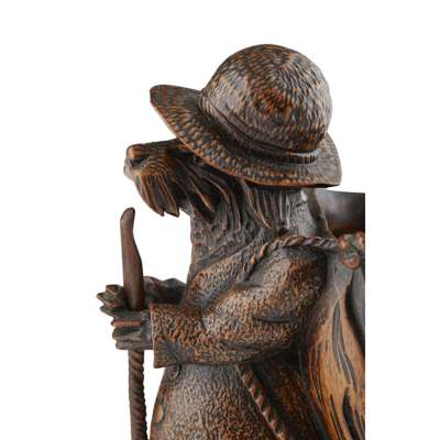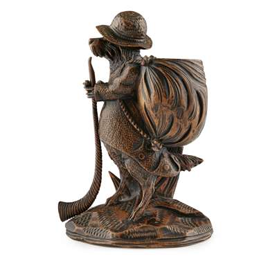 carved as a dog in Tyrolean dress and holding an Alps horn, with an open sack on his back, raised on a naturalistically carved oval base
