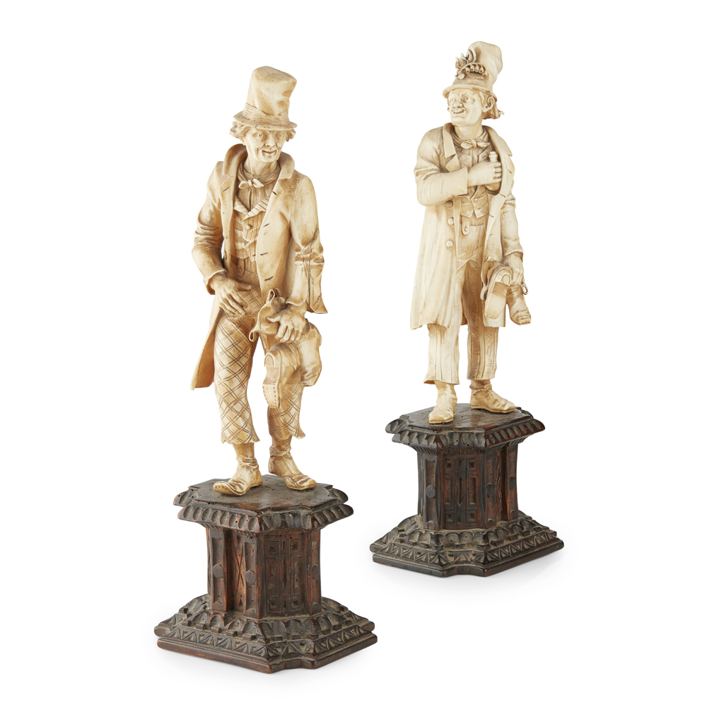 both with large hats, overcoats and holding boots in their left hands, raised on carved oak plinth bases (2)