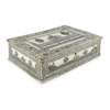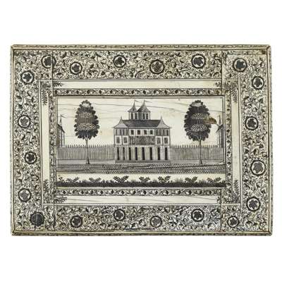 of rectangular form, pen-worked with a scene of a turreted house flanked by trees, within a scrolling border of flowers, with corresponding panels depicting buildings to the base, opening to a void interior with two enclosed compartments