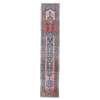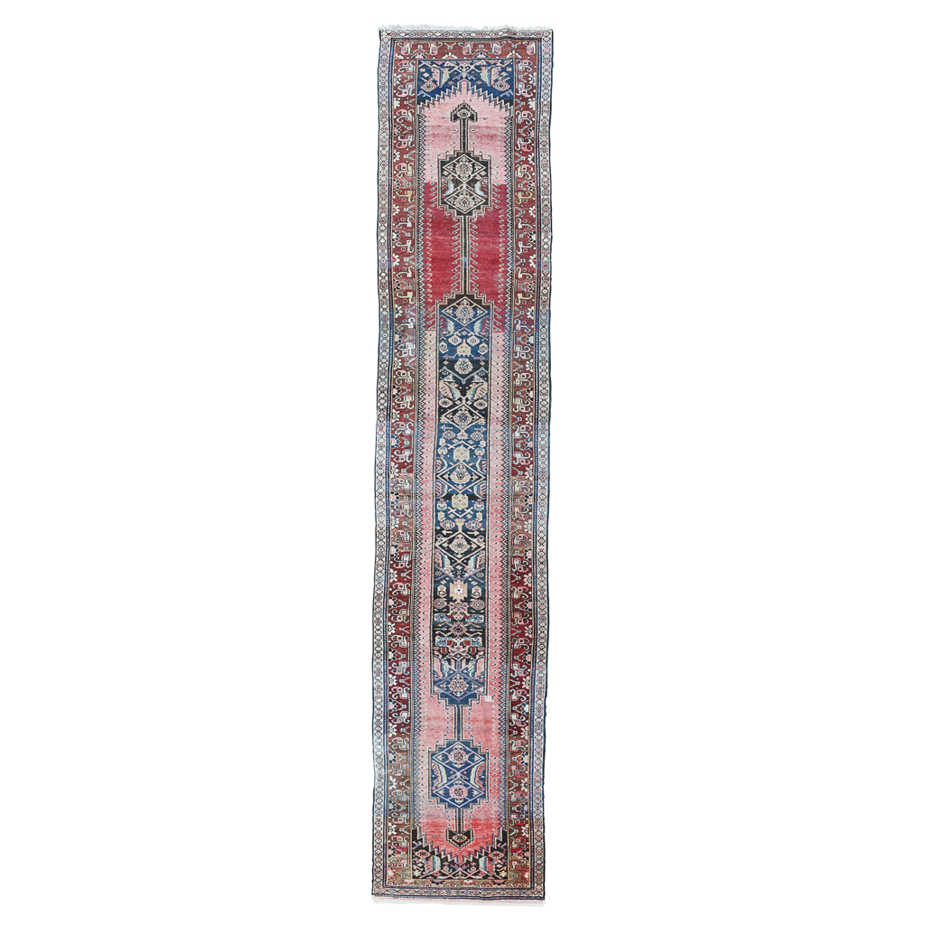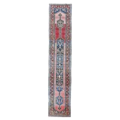 the abrash red field with elongated indigo medallion suspending pendants, within abrash brown stylised vine border