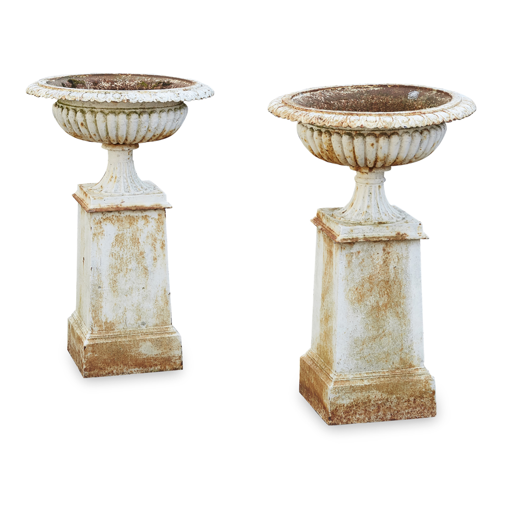 PAIR OF VICTORIAN SMALL CAST IRON URNS AND STANDS