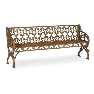 with quatrefoil pierced panel back and foliate scroll arms, raised on curved X form legs, unmarked