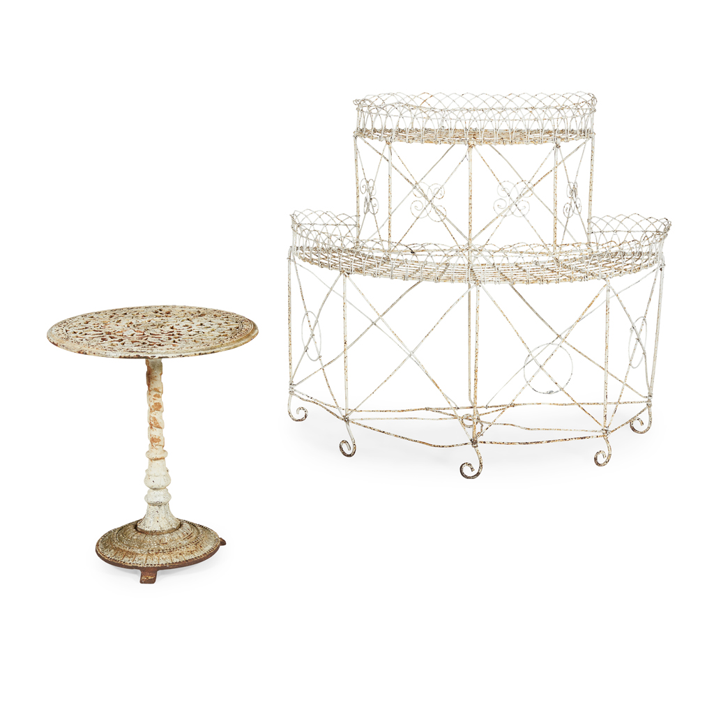 with two curved tiers; together with an EDWARDIAN CAST IRON TABLE with a pierced circular top on a spiral support, 52cm diameter, 61cm high (2)
