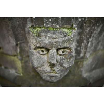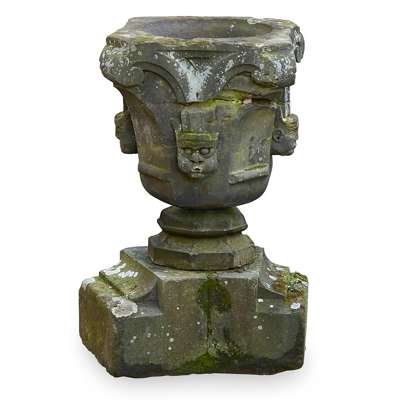 of octagonal bell form, the sides carved with masks and scrolls, on a conforming socle and stepped stone base
